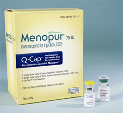 Menopur® (menotropins for injection, USP) is a preparation of gonadotropins, extracted from the urine of postmenopausal women, which has undergone additional steps for purification. Each vial of Menopur® contains 75 International Units (IU) of follicle-stimulating hormone (FSH) activity and 75 IU of luteinizing hormone (LH) activity, plus 21 mg lactose monohydrate and 0.005 mg Polysorbate 20 and Sodium Phosphate Buffer (Sodium Phosphate Dibasic, Heptahydrate and Phosphoric Acid) in a sterile, lyophilized form intended for reconstitution with sterile 0.9% Sodium Chloride Injection, USP. Menopur® is administered by subcutaneous (SC) injection. The biological activity of Menopur® is determined using the USP bioassays for FSH (ovarian weight gain assay in female rats) and LH (seminal vesicle weight gain assay in male rats), modified to increase the accuracy and reproducibility of these assays. The FSH and LH activity assays are standardized using the Fourth International Standard for Urinary FSH and Urinary LH, November 2000, by the Expert Committee on Biological Standardization of the World Health Organization (WHO ECBS). Human Chorionic Gonadotropin (hCG) is detected in Menopur®. Both FSH and LH are glycoproteins that are acidic and water soluble. Therapeutic class: Infertility. INDICATIONS Menopur® administered subcutaneously is indicated for the development of multiple follicles and pregnancy in the ovulatory patients participating in an ART program. Dosage Assisted Reproductive Technologies The recommended initial dose of Menopur® for patients who have received a GnRH agonist for pituitary suppression is 225 IU. Based on clinical monitoring (including serum estradiol levels and vaginal ultrasound results) subsequent dosing should be adjusted according to individual patient response. Adjustments in dose should not be made more frequently than once every two days and should not exceed 150 IU per adjustment. The maximum daily dose of Menopur® given should not exceed 450 IU and dosing beyond 20 days is not recommended. Once adequate follicular development is evident, hCG should be administered to induce final follicular maturation in preparation for oocyte retrieval. The administration of hCG must be withheld in cases where the ovaries are abnormally enlarged on the last day of therapy. This should reduce the chance of developing OHSS. Administration Dissolve the contents of one to six vials of Menopur® in one mL of sterile saline and ADMINISTER SUBCUTANEOUSLY immediately. Any unused reconstituted material should be discarded. Parenteral drug products should be visually inspected for particulate matter and discoloration prior to administration, whenever solution and container permit. The lower abdomen (alternating sides) should be used for subcutaneous administration. HOW SUPPLIED Menopur® (menotropins for injection, USP) is supplied in sterile vials as a lyophilized, white to off-white powder or pellet. Each vial of Menopur® is accompanied by a vial of sterile diluent containing 2 mL of 0.9 % Sodium Chloride Injection, USP: 75 IU FSH and 75 IU of LH activity, supplied as: NDC 55566-7501-1 : Box of 5 vials + 5 vials diluent. NDC 55566-7501-2 : Box of 5 vials + 5 vials diluent + 5 Q•Cap™ vial adapters. Storage Lyophilized powder may be stored refrigerated or at room temperature (3° to 25°C/37° to 77°F). Protect from light. Use immediately after reconstitution. Discard unused material. DIRECTIONS FOR USING MENOPUR® Wash hands thoroughly with soap and water. Before injections, the septum tops of the vials should be wiped with an aseptic solution to prevent contamination of the contents. To prepare the Menopur® solution, inject 1 mL of Sterile Saline for Injection, USP into the vial of Menopur®. DO NOT SHAKE, but gently swirl until the solution is clear. Generally, the Menopur® dissolves immediately. Check the liquid in the container. If it is not clear or has particles in it, DO NOT USE IT. For patients requiring a single injection from multiple vials of Menopur®, up to 6 vials can be reconstituted with 1 mL of Sterile Saline for Injection, USP. This can be accomplished by reconstituting a single vial as described above (see step 3). Then draw the entire contents of the first vial into a syringe, and inject the contents into a second vial of lyophilized Menopur®. Gently swirl the second vial, as described above, once again checking to make sure the solution is clear and free of particles. This step can be repeated with 4 additional vials for a total of up to 6 vials of lyophilized Menopur® into 1 mL of diluent. Draw the reconstituted Menopur® into an empty, sterile syringe. Hold the syringe pointing upwards and gently tap the side to force any air bubbles to the top; then squeeze the plunger gently until all the air has been expelled and only Menopur® solution is left in the syringe. Menopur® works if it is injected SC . The recommended sites for SC injection are either side of the lower abdomen alternating between left and right sides of the lower abdomen below the naval. SC injection of Menopur® into the thigh is not recommended unless the lower abdomen is not useable because of scarring, surgical deformity or other medical conditions. The injection site should be swabbed with alcohol. Clean about two inches around the point where the needle will go in and let the alcohol dry for at least one minute before proceeding. For SC injection, the needle should be inserted at a 90° angle to the skin surface.
